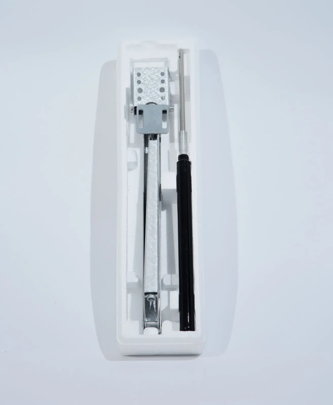 Automatischer Öffner für Dachfenster – Zylinder mit Hebel, der das manuelle Öffnen ersetzt. Der Zylinder arbeitet auf Basis der thermischen Ausdehnung von Wachs und verschiebt bei steigender Temperatur im Gewächshaus den Hebel, um das Fenster zu öffnen.